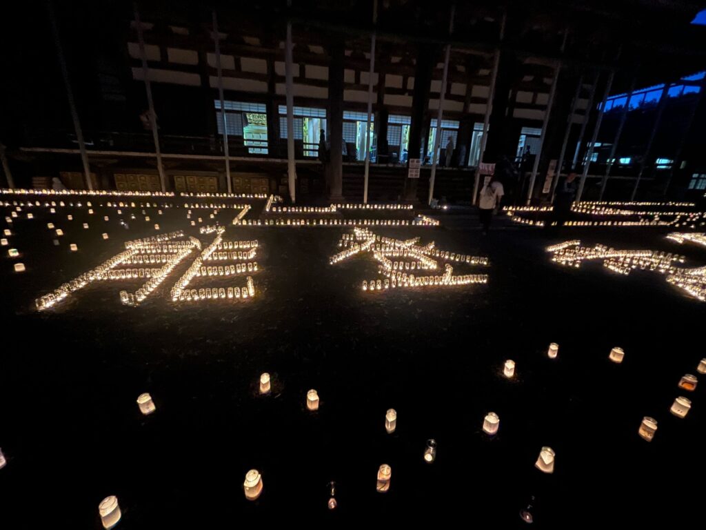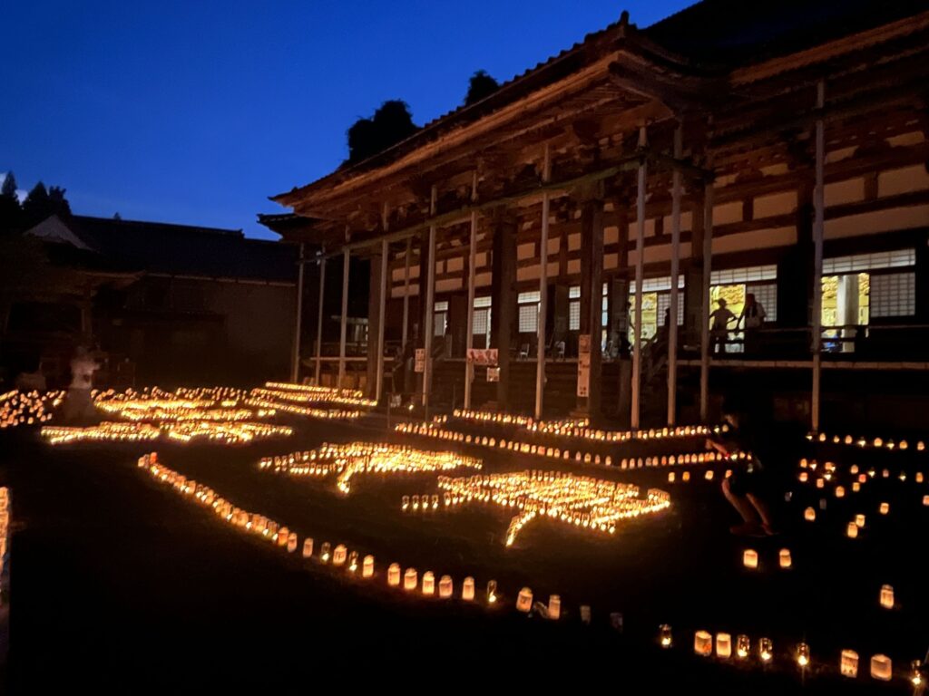 夕方に金蔵に戻り,ろうそくの着火作業を行いました.その後,夕食にIさん特製のイノシシカレーをいただきました.前日から具材を煮込み,スパイスをふんだんに使用した本格的なカレーでとてもおいしかったです.夕食を食べ終え,日が暮れ始めると,続々と正願寺に人が集まり始めました.正願寺のお堂では,トランペットやフルート,歌のコンサートが開催されました.お盆の時期ということもあり,集落住民だけでなくその子や孫なども来場しており,コンサートでは子どもから大人までなじみのある曲が多数演奏され,特に「花は咲く」の演奏には深く心を動かされ思わず涙を流してしまいました.境内に準備したろうそくも日が暮れると一つ一つがキラキラと輝き,とても美しかったです.そして無事に,催事当日を終えることができました.