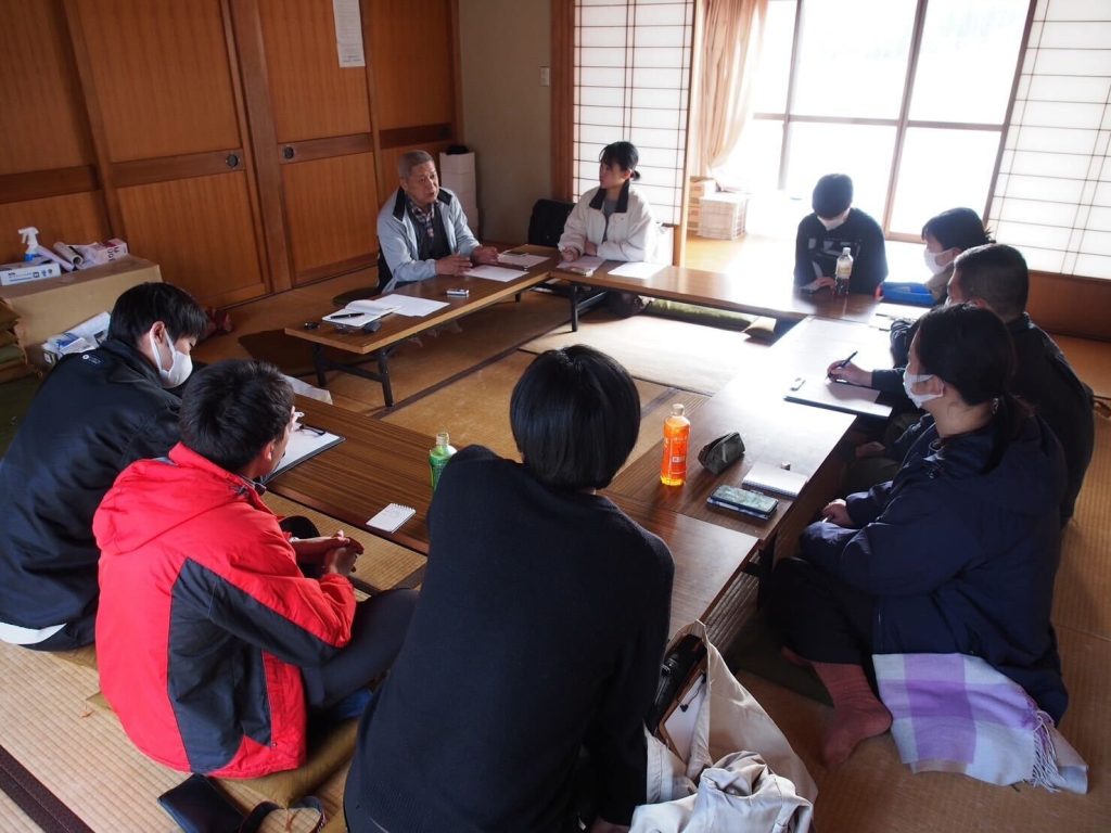 「居住環境」という言葉の定義は一概には難しいのですが,被災地において特に重要な論点は,①安全性,②利便性の2点だと考えています.私の研究においては,前者については人的交流や地域コミュニティを,後者については買い物や交通について焦点を当てています.甲で暮らす方々を取り巻く「居住環境」の現状を明らかにすることで,この集落の集落の持続可能性を考える一助になればなと.さらに,甲には,「穴水町甲復興団」という復興のキーパーソンが存在します.地元出身の若手メンバー数名によって立ち上げられたこの団体は,毎月1回,集落内の公民館で「甲復興カフェ」を開催しています.誰でも気軽に参加できるこのカフェでは,地域内外の人々が集い,お茶やお菓子を囲みながらざっくばらんに話をすることができる場となっています.3月の調査ではこれを対象に参与観察調査を実施しています.