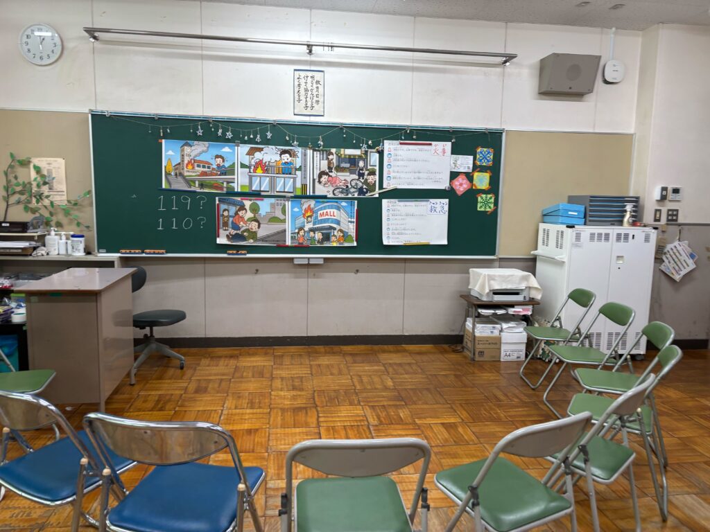 通報訓練では,黒板に貼られたイラストの状況に合わせて,実戦形式で通報の練習を行いました.電話をかける機会自体が減ってきている今の時代だからこそ,いざというときにパニックにならないためにも大切な経験になると感じました.